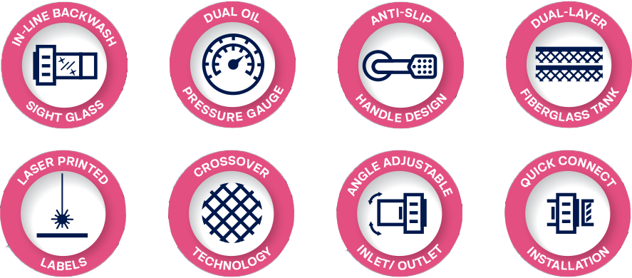 Each unit is 100% factory tested and comes fitted with an easy-to-use 6-way multiport valve, plus an angle-adjustable union to help reduce pipe stress during positioning and changeovers.